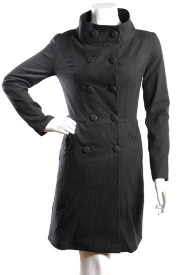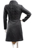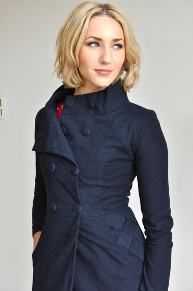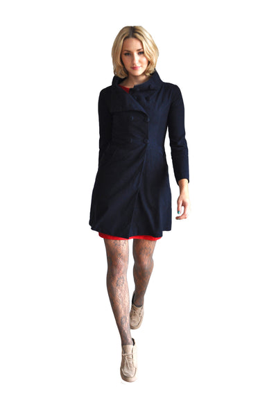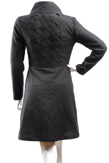 Fully lined double breasted coat with fabric covered buttons. Weave detail in front pocket and center back.